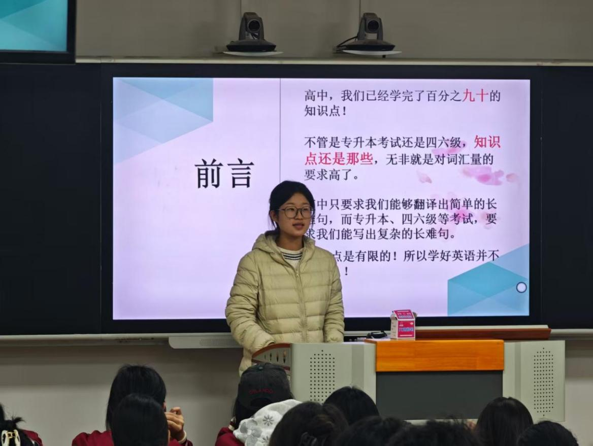 随后,李静然同学围绕《大学英语》分享心得。她强调,兴趣是驱动学习的动力,她通过英文影视赏析、英文歌曲传唱等多元方式,有效激发了同学们的学习热情。针对词汇积累这一基础环节,她推荐了多款实用工具与高效记忆技巧,并结合大学英语四六级、专升本等各类考试的题型特点,针对性地给出了备考策略,帮助新生们明确学习重点、提升学习效率。