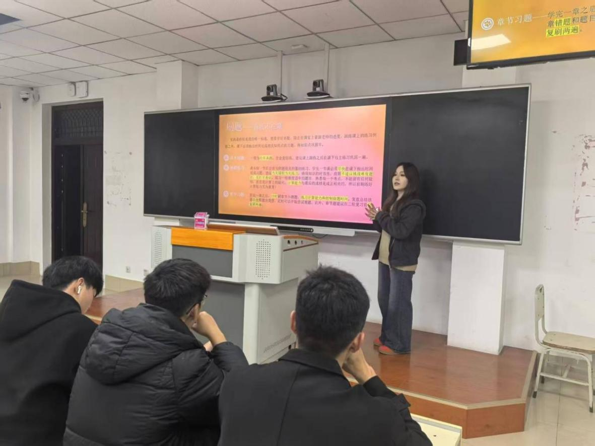 在交流会上,司佳晨同学首先讲解了《高等数学》这一课程,以历年真题为例,通过她所总结的解题思路,帮助新生们厘清逻辑、掌握核心要点。针对部分新生的畏难心理,她总结出“牢基础、强计算、提速度、练套题、避难题”的五步学习法,为新生规划了清晰的学习路径。同时,她教导同学们,学习高等数学没有捷径,唯有持之以恒的积累与积极向上的心态,方能收获佳绩。