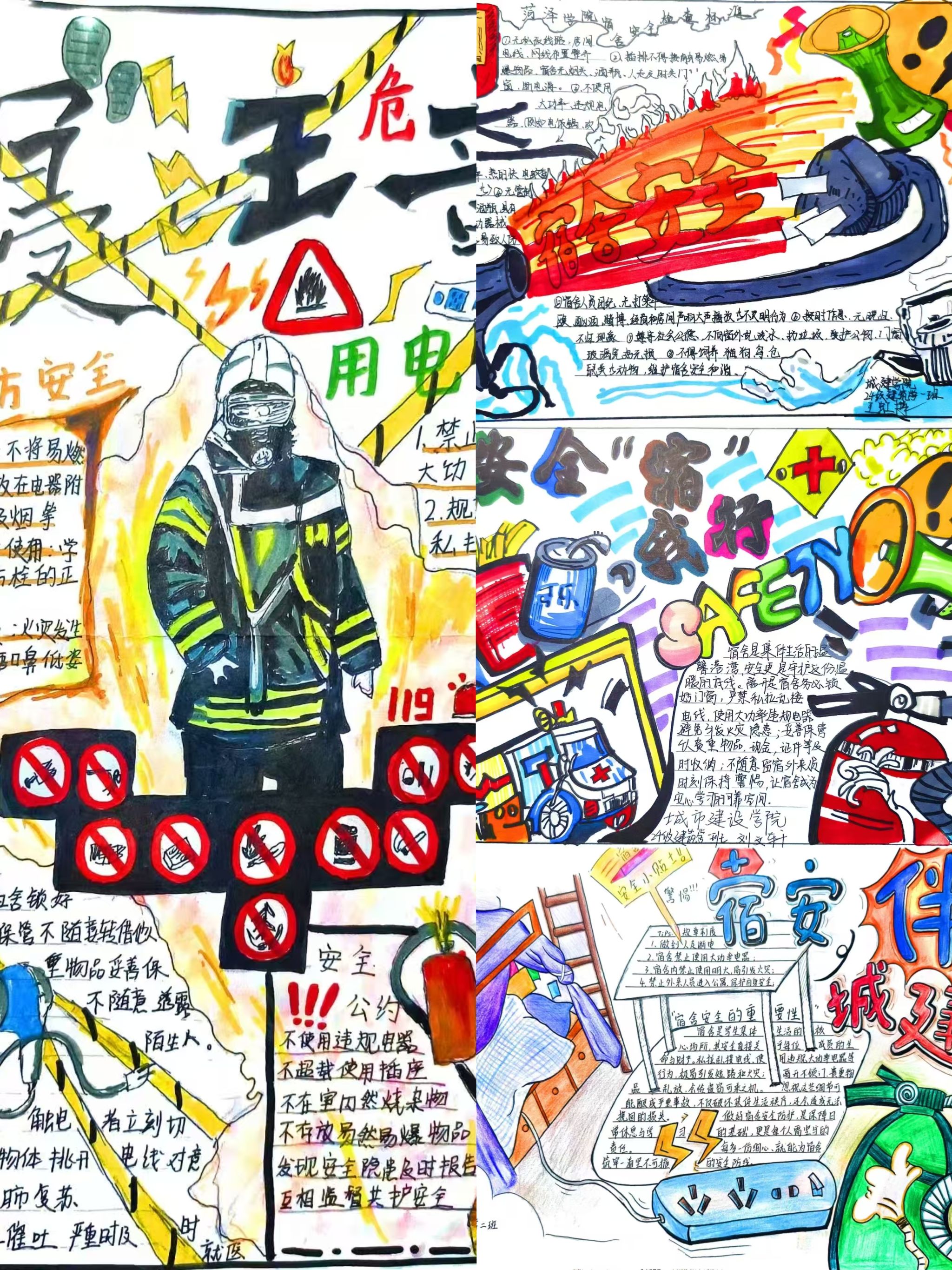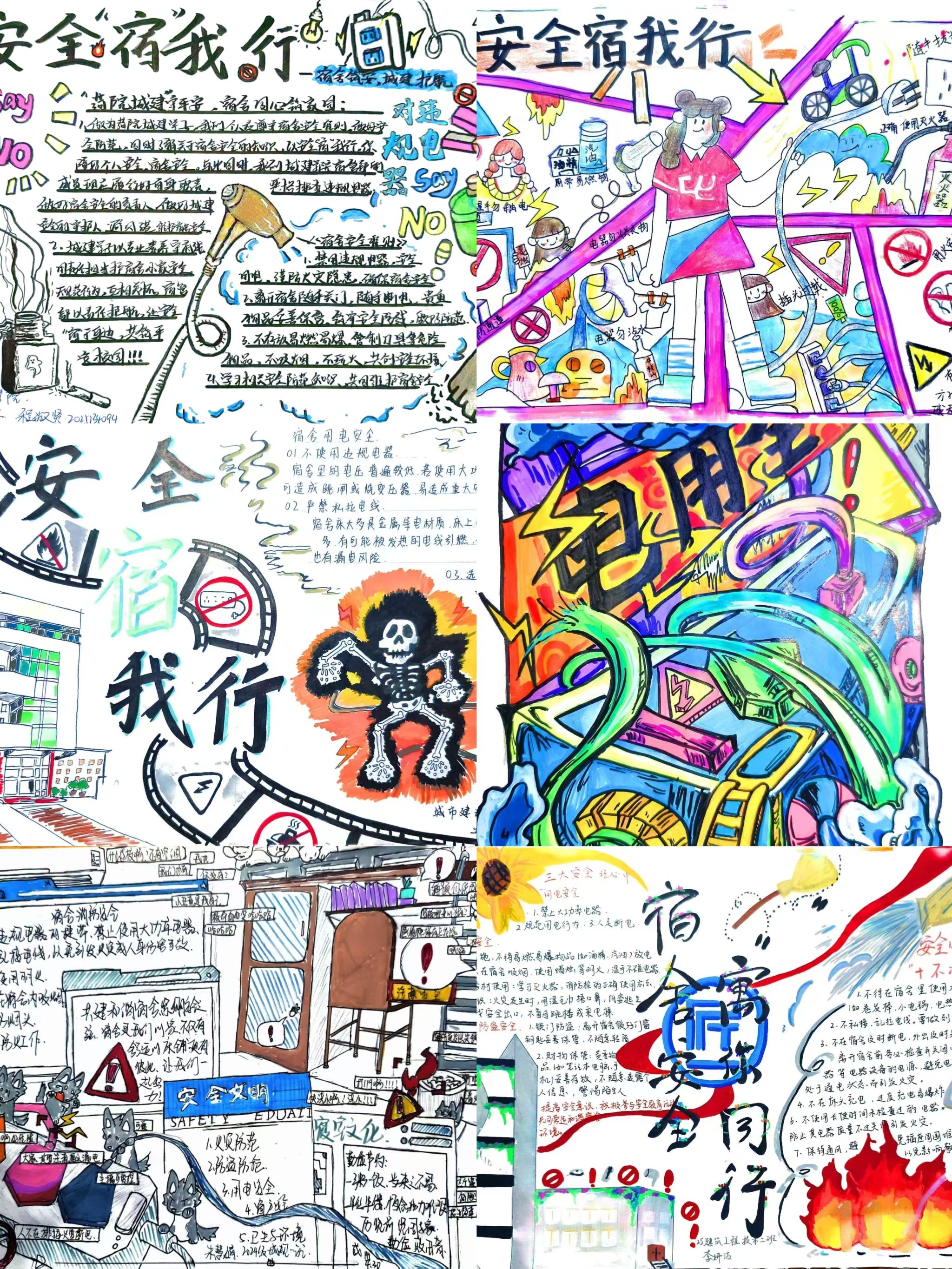 活动启动后,全院各年级、各专业学生积极参与,将对宿舍安全的理解与创意设计相结合,用画笔、色彩与文字打造出一幅幅兼具知识性与艺术性的手抄报作品。在手抄报中,同学们用自己独特的笔触展现了对于宿舍安全的独特理解:有的作品采用漫画形式,生动还原了宿舍违规用电、私拉乱接电线等常见安全隐患场景,并配上幽默易懂的警示文字,让安全知识 “看得见、记得住”;还有的作品融入温馨元素,通过绘制整洁有序的宿舍环境、同学间互助提醒的画面,传递 “宿舍安全靠大家” 的集体理念。