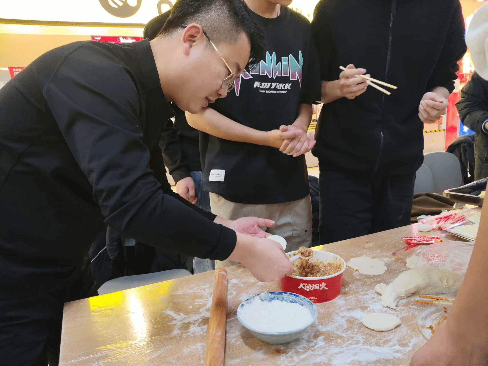 活动现场暖意融融、热闹非凡。全体师生分工明确、协作默契,擀皮、填馅、捏褶有条不紊,欢声笑语此起彼伏。初次尝试包饺子的同学,在老师和学长学姐的耐心指导下,渐渐摸索出技巧,形态各异的饺子很快便摆满了托盘。大家一边忙活,一边分享各地冬至习俗与趣闻,北方的饺子文化、南方的汤圆传统在交流中碰撞交融,让活动更添文化韵味。后厨师傅们同步忙碌,将包好的饺子下锅烹煮。热气腾腾的饺子端上桌,师生们围坐品尝,鲜香的味道与温馨的氛围交织,满溢着冬日独有的温暖。