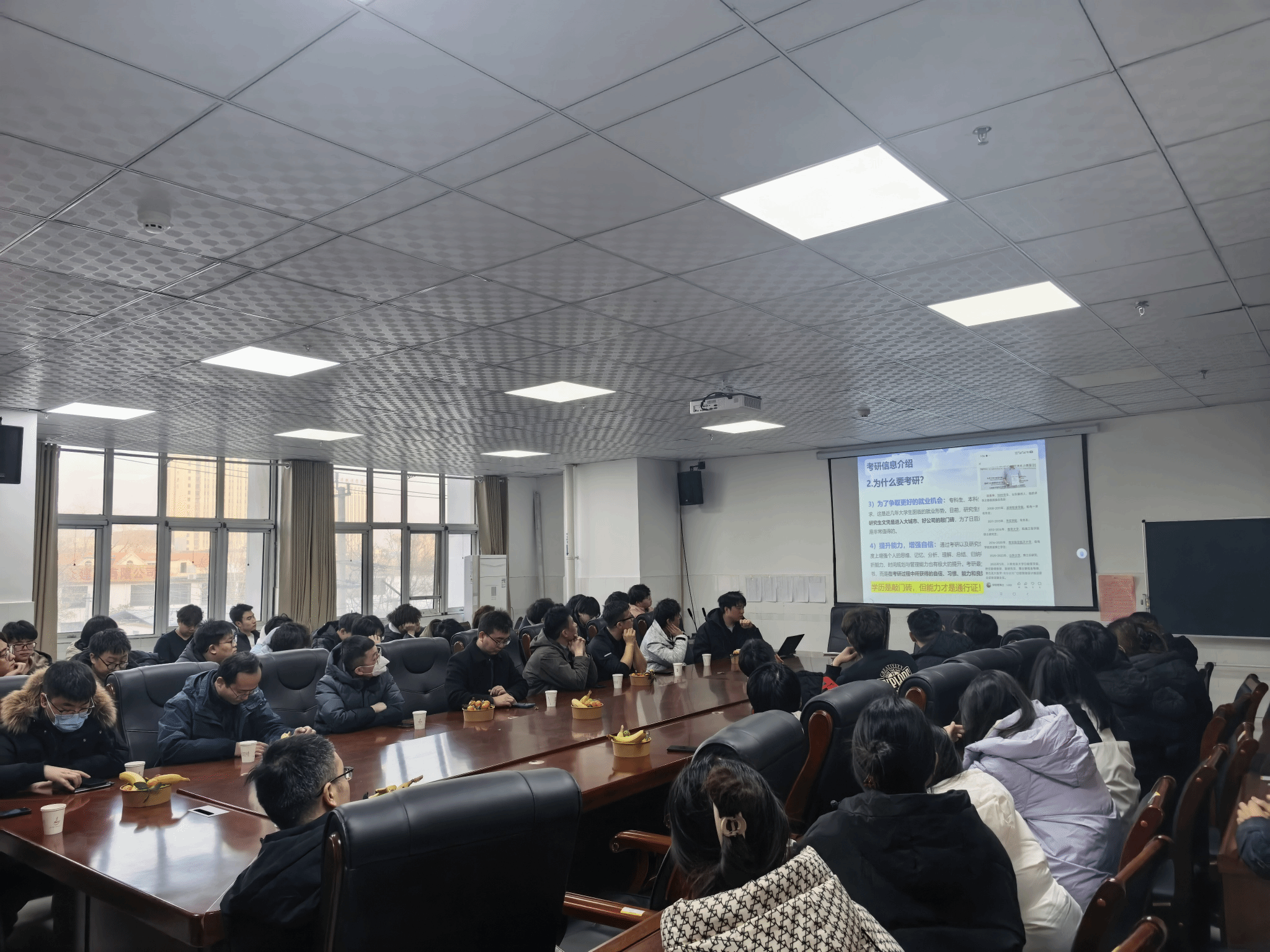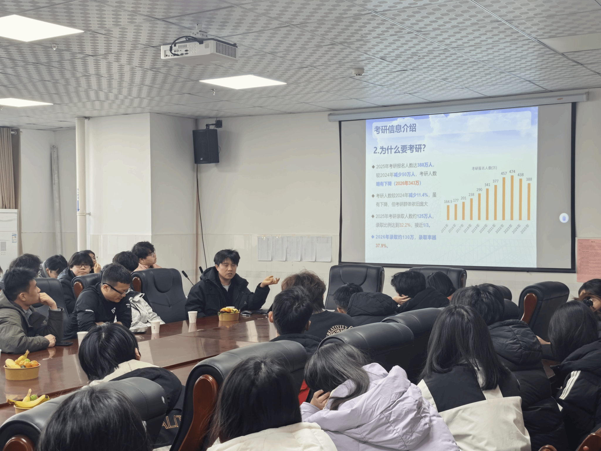 在专业指导环节,教师团队各展所长,带来针对性极强的备考干货。袁国涛老师通过精心制作的PPT,围绕考研全流程进行系统讲解,从复习规划的阶段划分到时间管理的实用技巧,再到调剂政策的核心要点,内容翔实、条理清晰,为同学们构建了完整的备考框架。朱明听老师聚焦学科难点,针对土木工程专业考研的核心科目——高等数学,深入剖析了备考中的重点题型与常见误区,分享了分层突破、错题复盘的高效学习方法,助力同学们攻克高数难关。李光跃老师则从院校选择的关键逻辑出发,建议同学们结合自身学习实力、专业适配度与未来发展规划理性择校,既不盲目追高,也不低估自身潜力,为学子们精准定位提供了科学参考。此外,张东老师分享了前几届学长学姐的考研录取情况及备考经验,用身边鲜活的案例传递奋进力量,让同学们对考研之路有了更直观的认知。