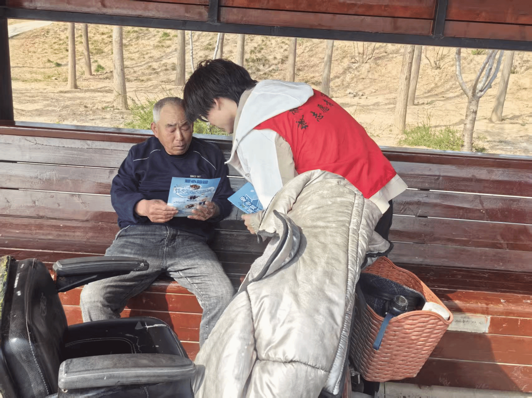 活动现场,志愿者们身着统一志愿服装,分组分片深入社区各个角落,通过发放宣传单、现场耐心讲解等方式,向过往居民全面介绍“爱心陪诊”小程序的功能、使用方法及服务流程。针对社区老年人普遍存在的“数字鸿沟”问题,志愿者们手把手教学,从小程序注册、陪诊服务预约,到就诊流程指引、后续服务反馈,逐一拆解操作步骤,用通俗易懂的语言解答居民关于陪诊服务范围、预约时效、服务保障等各类疑问。同时志愿者们还精心准备鲜花与手工纸板,为爷爷奶奶们拍摄春日纪念照,定格温暖笑容。活动中,大家耐心陪伴老人,用镜头记录下长辈们的幸福瞬间。
