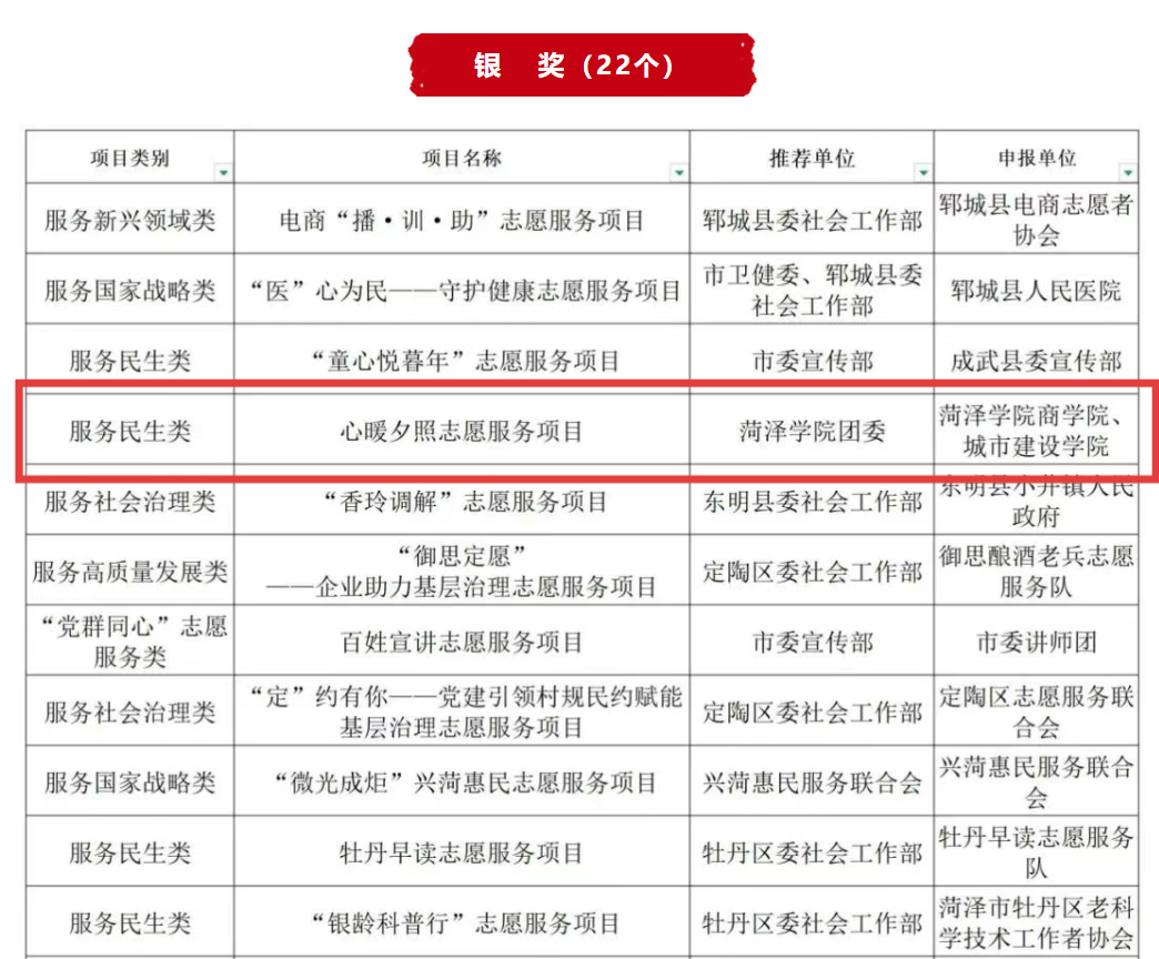 近日,2025年菏泽市志愿服务项目大赛获奖名单揭晓,由最新bbin官方平台直营网站与商学院联合申报的“心暖夕照”志愿服务项目,凭借其扎实的服务基础、创新的运作机制以及广泛的社会影响力,从众多参赛团队中脱颖而出,成功荣获大赛银奖,为学校志愿服务工作再创佳绩。